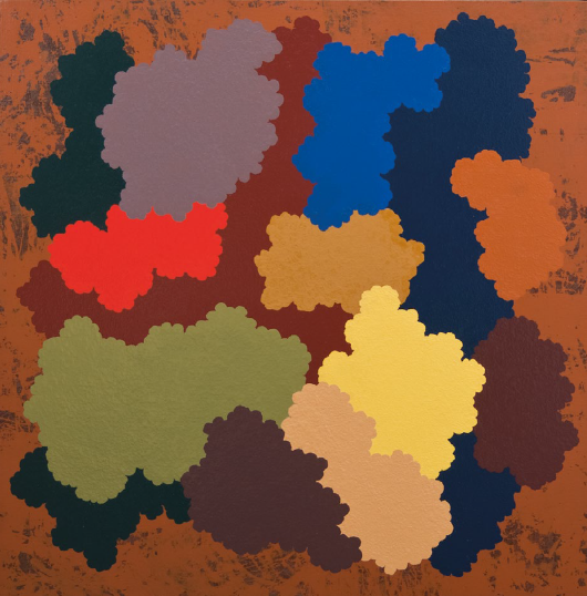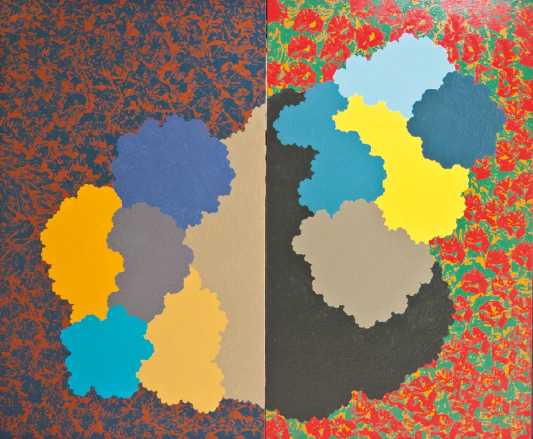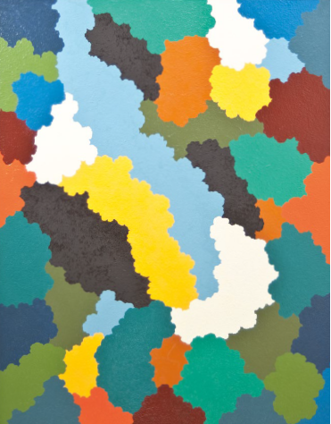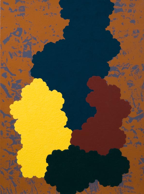 entamé une série de variations en forme de tâches colorées, peintes à plat sur des tréteaux, d’abord grandes et peu nombreuses puis foisonnantes et de taille plus réduite.